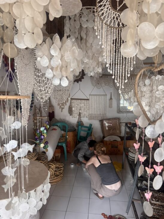 Der er rigeligt, der frister på Bali, så det kan betale sig at gå lidt målrettet. Priserne ved markeder og boder er lavest, men kvaliteten er også svingende. Her kan det betale at handle sig op til 70% ned fra den første pris. I de “rigtige” butikker er priserne ofte faste men kvaliteten også bedre. Vi købte rattan tasker, pyntepudebetræk, muslinge lamper, bast lamper, løse bukser, yogatøj og en uundværlig vifte. Gå udenom mærketing- som typisk er fake.