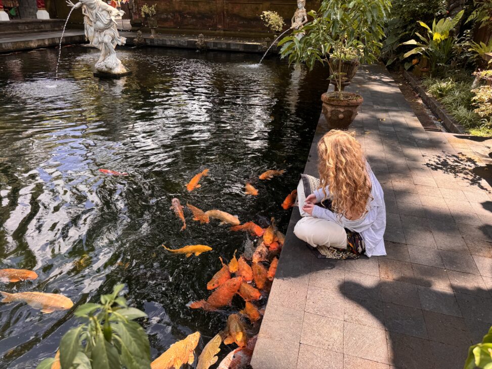 Håndlæser: Bali er et meget spirituelt sted, og lokale healere er en helt normal del af hverdagen. Vi ville undgå det turistede “Eat, pray, love” spor og gik efter en respekteret healer de lokale også bruger. Vi fik et afbud hos Agus som ellers angiveligt har måneders ventetid. Vi kørte en lille time fra Ubud og tilbragte så 3 timer med blomsterbade, healing, håndlæsning, flere blomsterritualer (omkring 4 kg blomster pr person). Der var klingene skåle, røgelse, farverige stoffer og Agus som healede os med ti cm (!) lange fingernegle. Jeg syntes det var ret interessant. Teenageren fandt det hele “meget mærkeligt”. Og det gav anledning til gode snakke om at “mærkeligt” er et kulturelt begreb. Agus fortalte, at han snart indleder optagelser med Netflix som vil lave en serie om hans liv, healing og arbejde mod human trafficking. Den holder vi øje med.