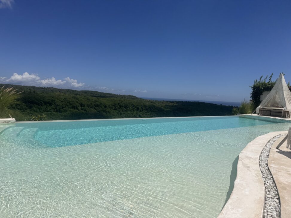 Atalayas Villas Nusa Penida: Til ca. 700 kr. for en overnatning og med perfekt udsigt fra infinity pool over jungle og hav var dette hotel nok vores yndlings. Små lyse hytter og et helt vidunderligt poolområde med hvide loungesenge hvor lyset strømmer ind gennem et stormasket net gjorde stedet helt magisk. Vi bookede gennem booking.com