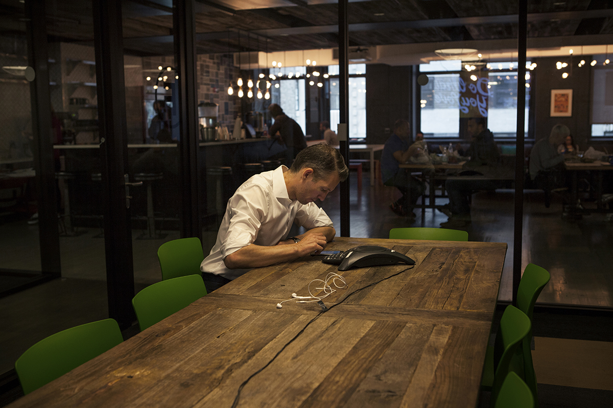 Dennis Mortensen har telefonmøde på sin arbejdsplads.